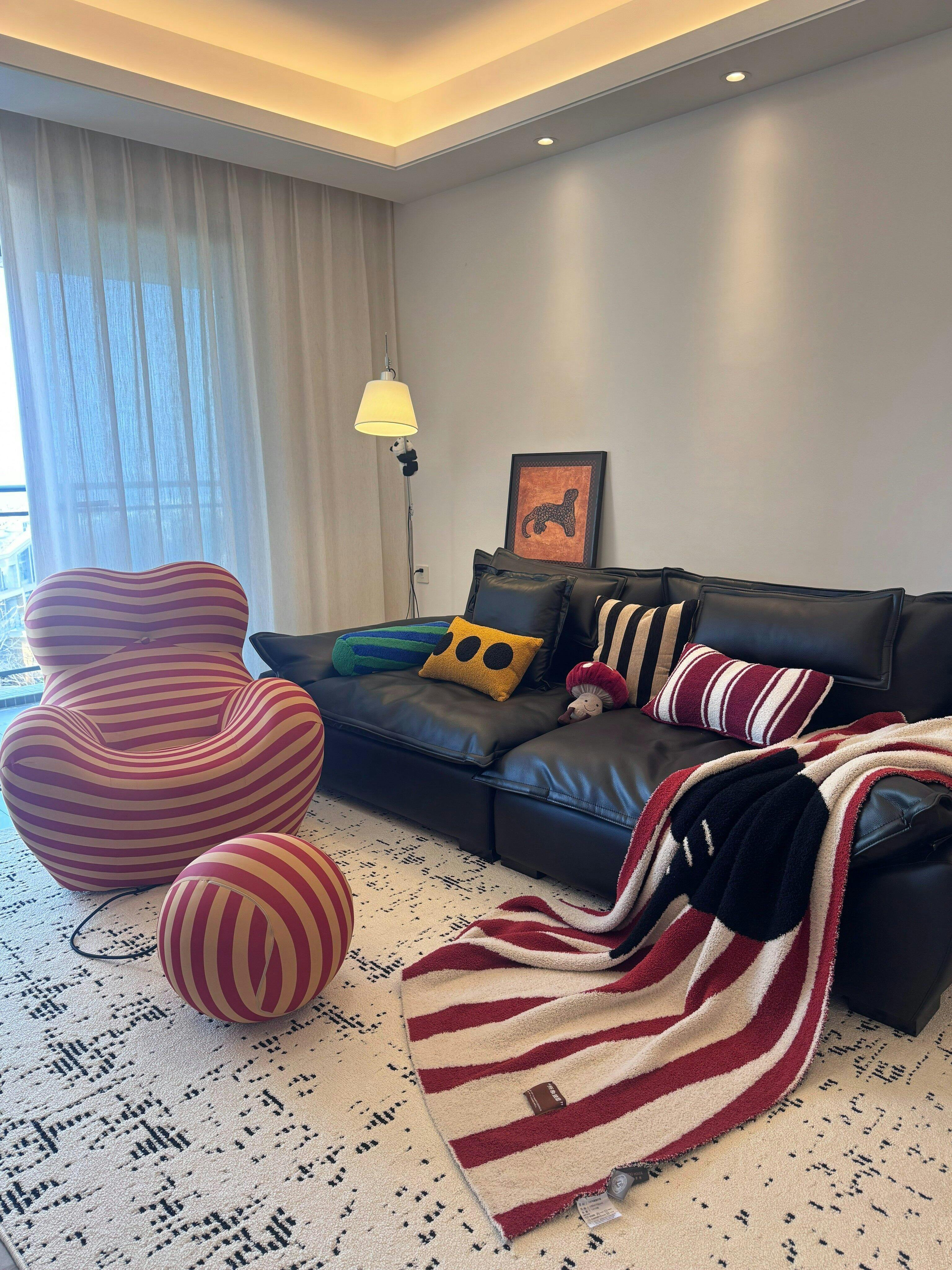 Inspirada en el concepto de "bola y cadena", la silla cuenta con una otomana redonda unida de forma divertida mediante un cordón. La otomana está confeccionada con la misma tela de rayas rojas y beige que la silla, lo que mantiene un aspecto cohesivo.