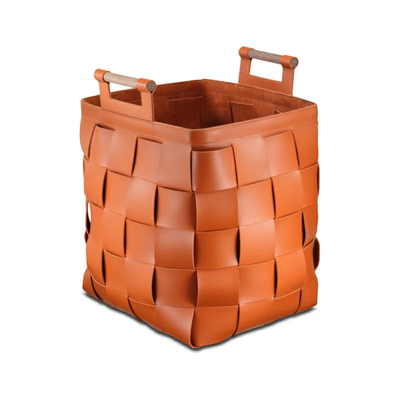 Timeless and sophisticated, this basket will be a precious addition to a modern study, living room, or powder room. Its versatile functionality merges with striking allure, bestowed by the complex texture of its surface and the brown color that will suit many different decors. The structure is made of water-resistant stripes of saddle leather with two walnut cylinders as handles.