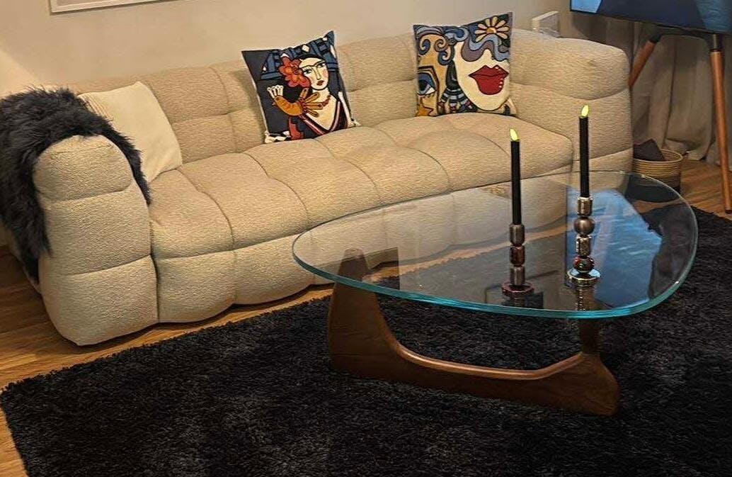The Noguchi Replica Glass Top Coffee Table is a timeless masterpiece. Its sculptural wooden base, expertly crafted, forms a captivating interlocking design. The sleek, rounded triangular tempered glass top adds elegance, effortlessly merging art and function. A must-have for those seeking iconic mid-century modern style.